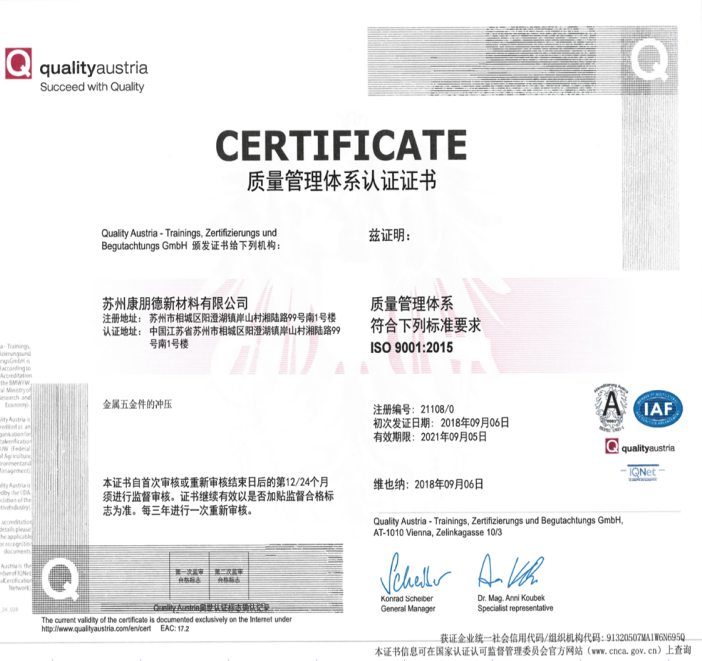 為了更好的使產(chǎn)品質(zhì)量得到控制,使顧客更加滿意,內(nèi)部管理水平得以提升,降低企業(yè)的管理成本并提高公司的工作效率,蘇州康朋德大力在內(nèi)部推行ISO體系,讓公司管理更加系統(tǒng)和規(guī)范。并于2018年9月6日取得了認證。